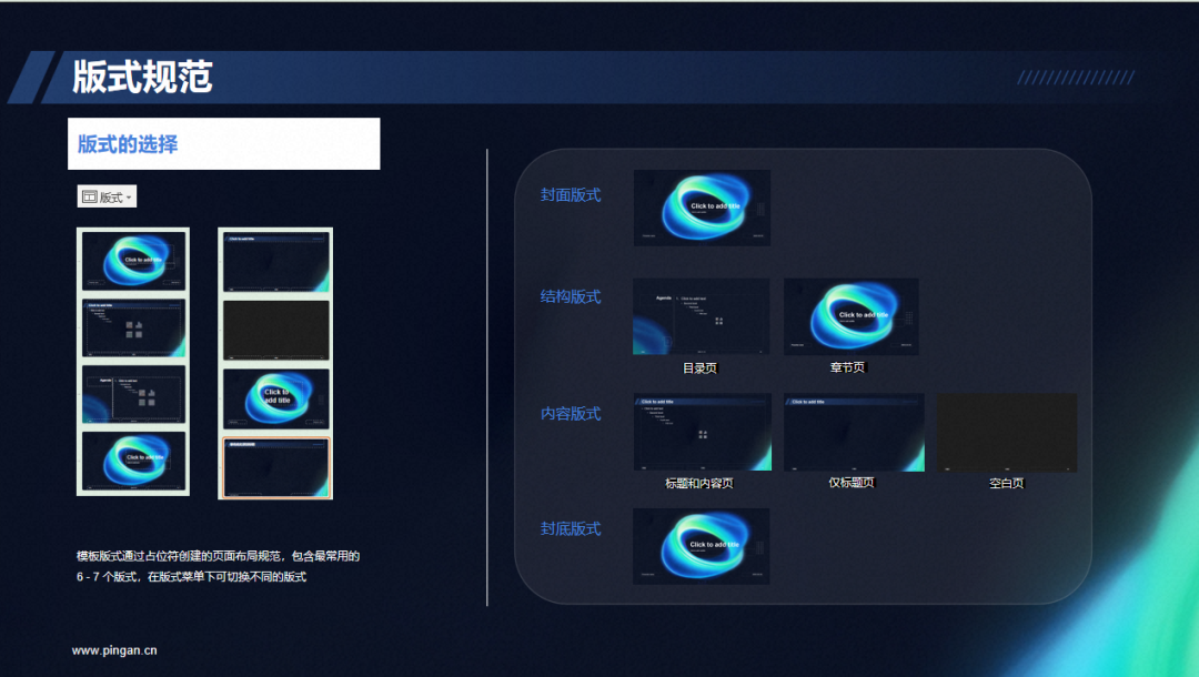 2️⃣ 固化版式结构:将封面、目录、过渡页、内容页、结束页等版式固定下来,确保 AI 生成的每一页都结构清晰、布局合理。