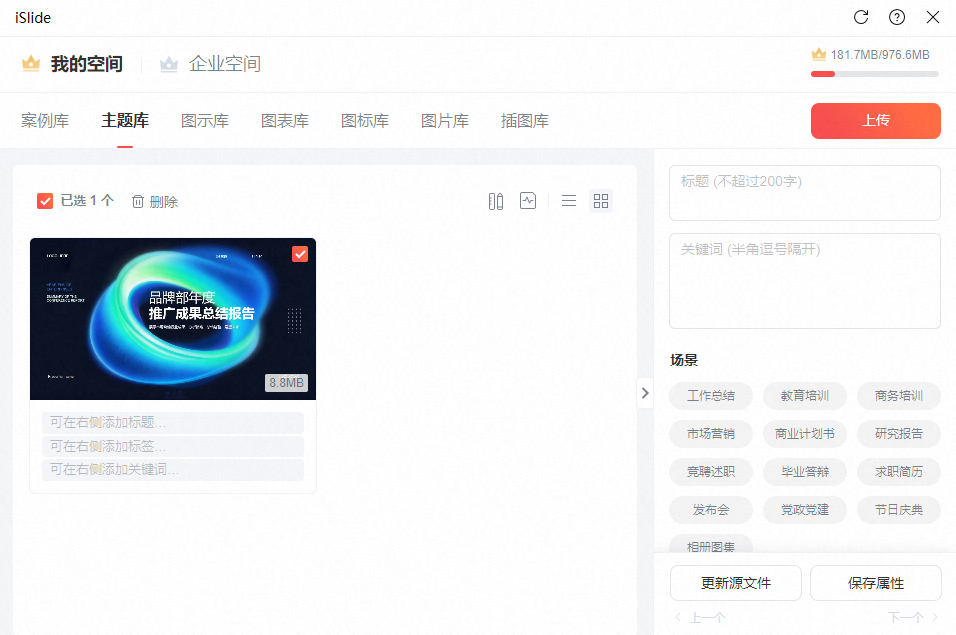 3️⃣ 协助上传至你的专属云空间:将这套优化好的主题,部署到你的 iSlide — 我的空间、企业空间。从此,它就会出现在主题库中,成了团队共用的 “品牌设计大脑”。