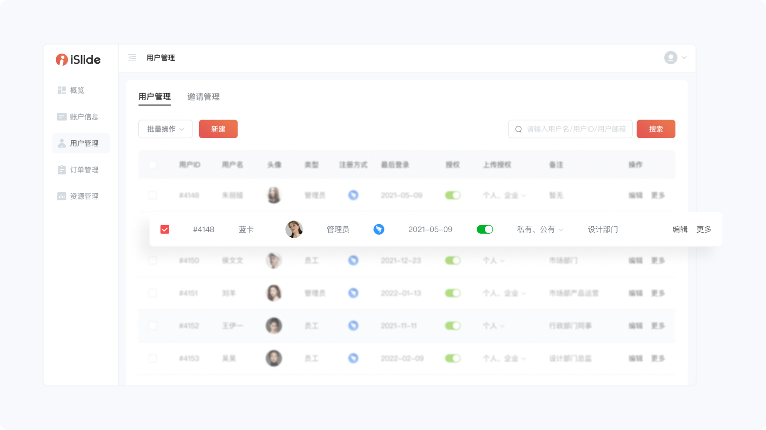 在企业管理后台,每一份的PPT下载的权限受到严格监控,企业机要信息安全得到最大的保障。关于PPT的信息安全也是iSlide目前颇为金融行业青睐的原因之一。