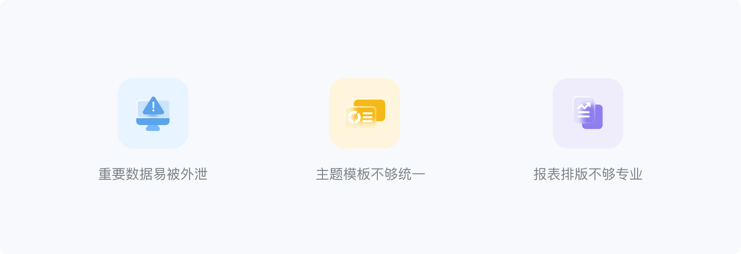 许多企业不管是对内与对外都没有统一的主题模板,而每一次面对客户都需要创建一个新的场景模板,会非常的浪费时间,iSlide会提供两套及以上的VI专属配色主题模板,然后搭配iSlide的图示素材库使用,快速把一个方案搭建为VI视觉统一的PPT模板。