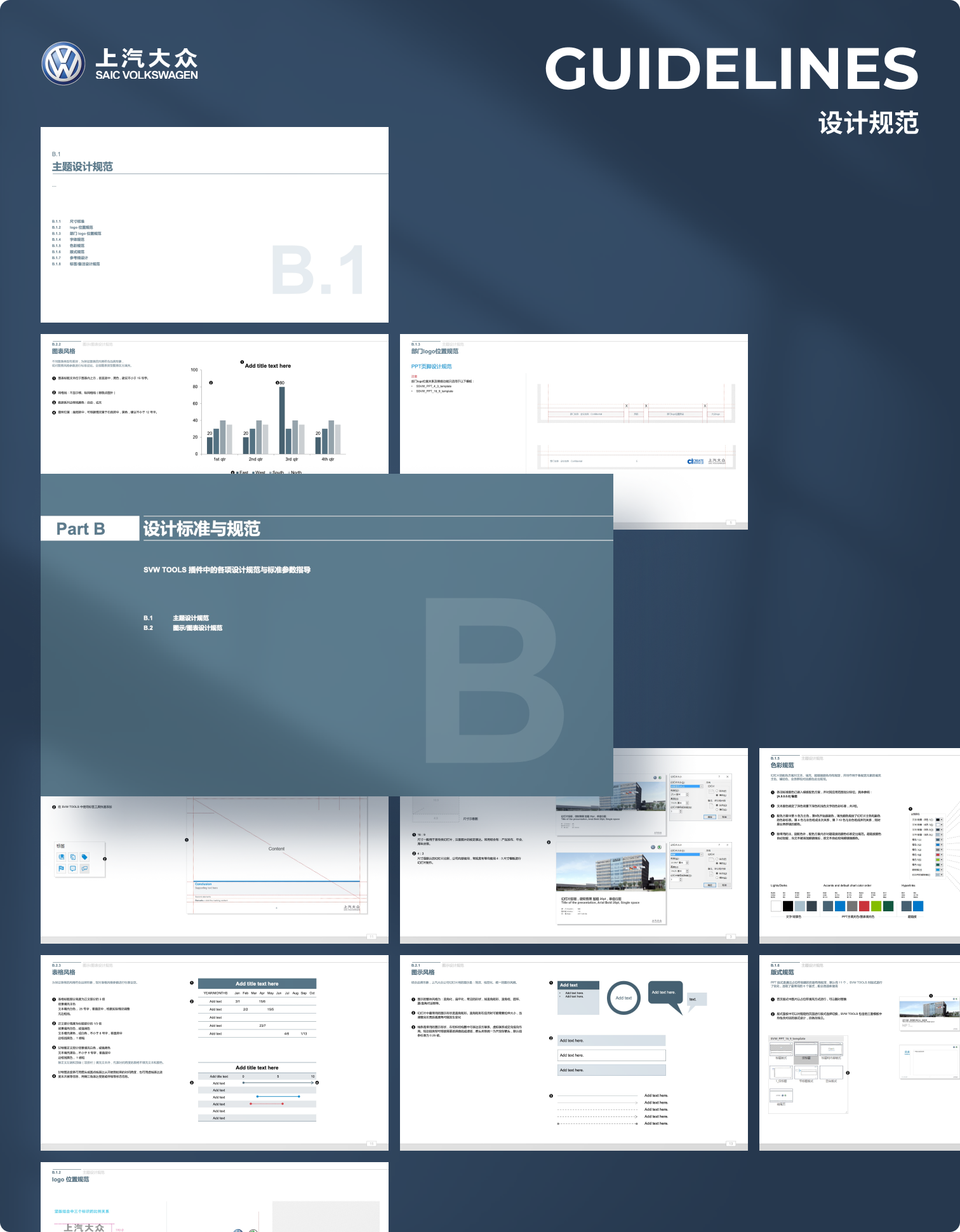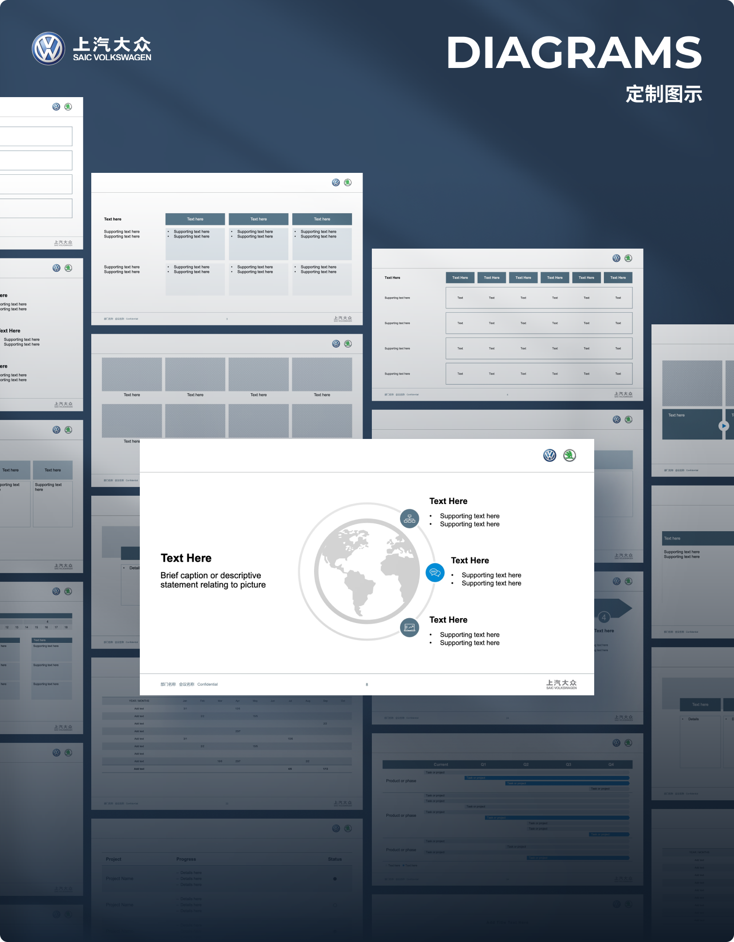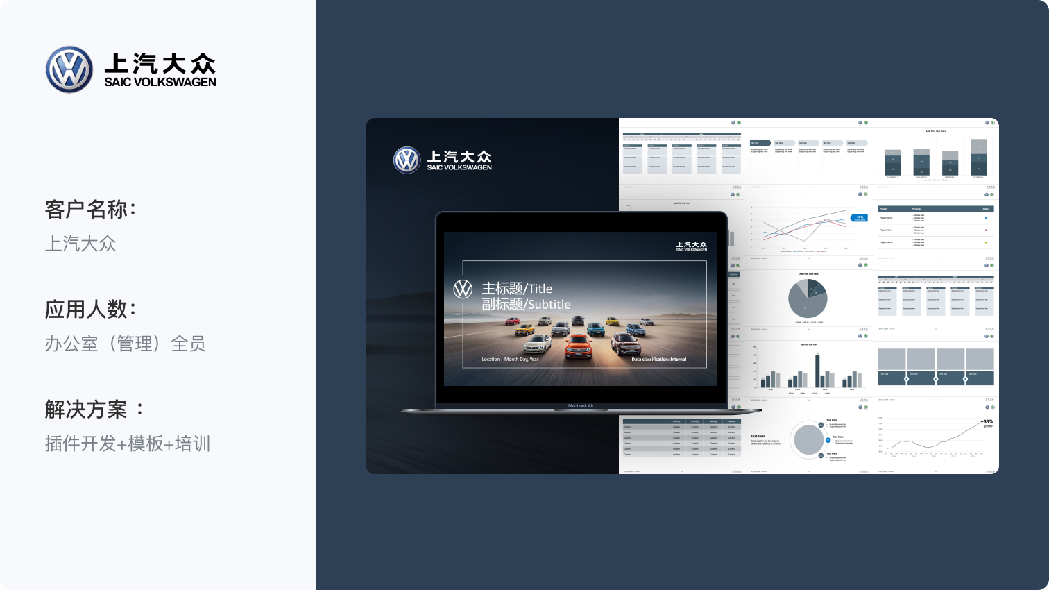 上汽大众集团的PPT展示需求包括大众和斯柯达两个主要子品牌,在对外视觉传达上需要严格遵循VI设计规范,并要求能在离线环境下使用iSlide插件设计辅助功能和模板资源库,同时由于内部职员PPT应用水平存在一定的差异性,对外展示类型的PPT缺少设计感,为此,iSlide基于客户所提供的原始模板进行符合PPT参数规则的设计优化,并基于VI图形规范,和PPT内容框架,设计保护图表,图文组合等内页常用模板。