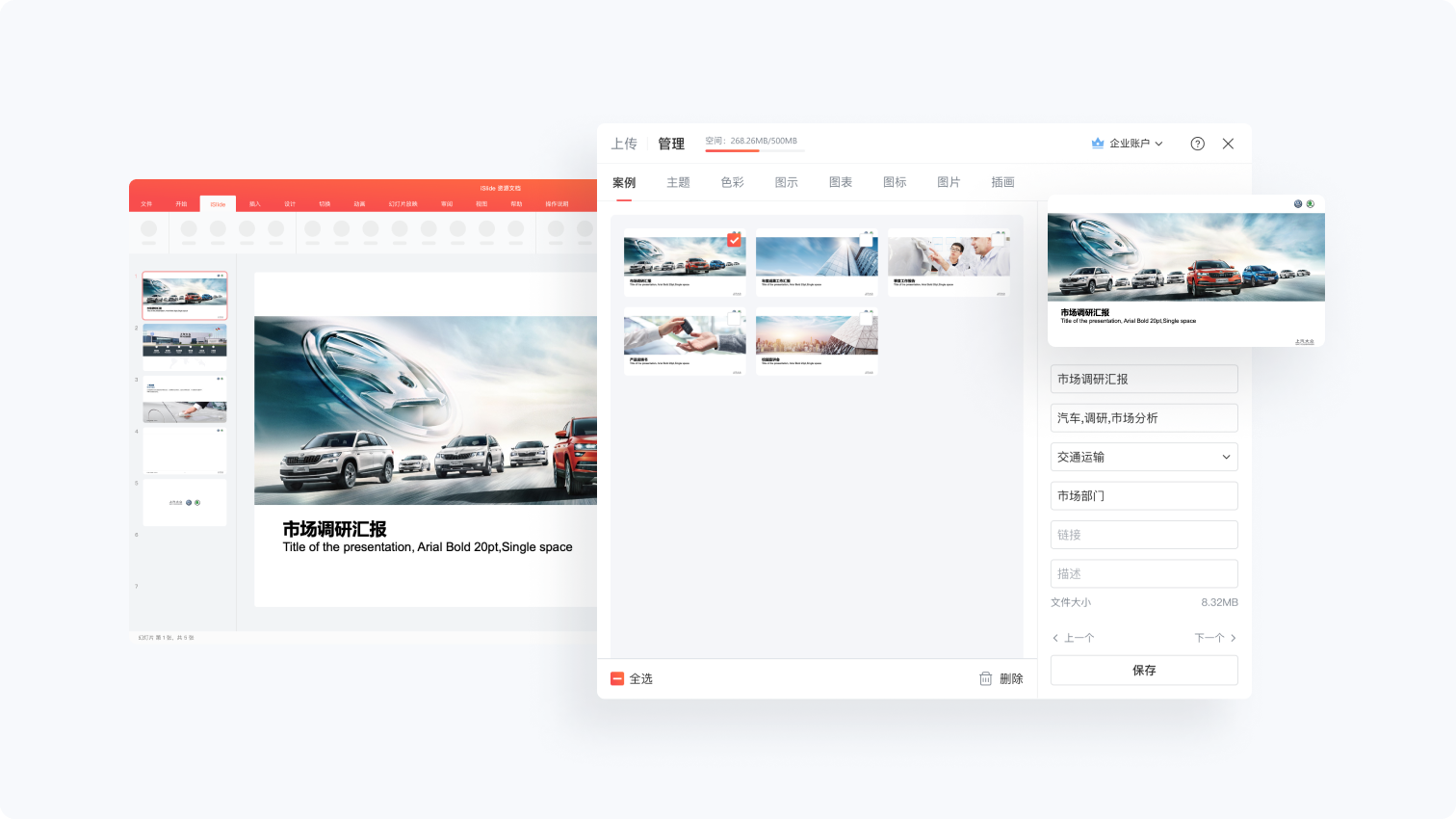 在协同办公的大趋势下,PPT也不再是单打独斗的独立文档,在汽车行业公司最开始由市场部门做出调研PPT,可以直接变成提供给产品部门的需求分析,最后由产品研发人员插入专业的原型图提交给研发部门,大家可以在统一的后台上传、下载、修改需求文档,最后变成产品优化/升级的汇报方案。