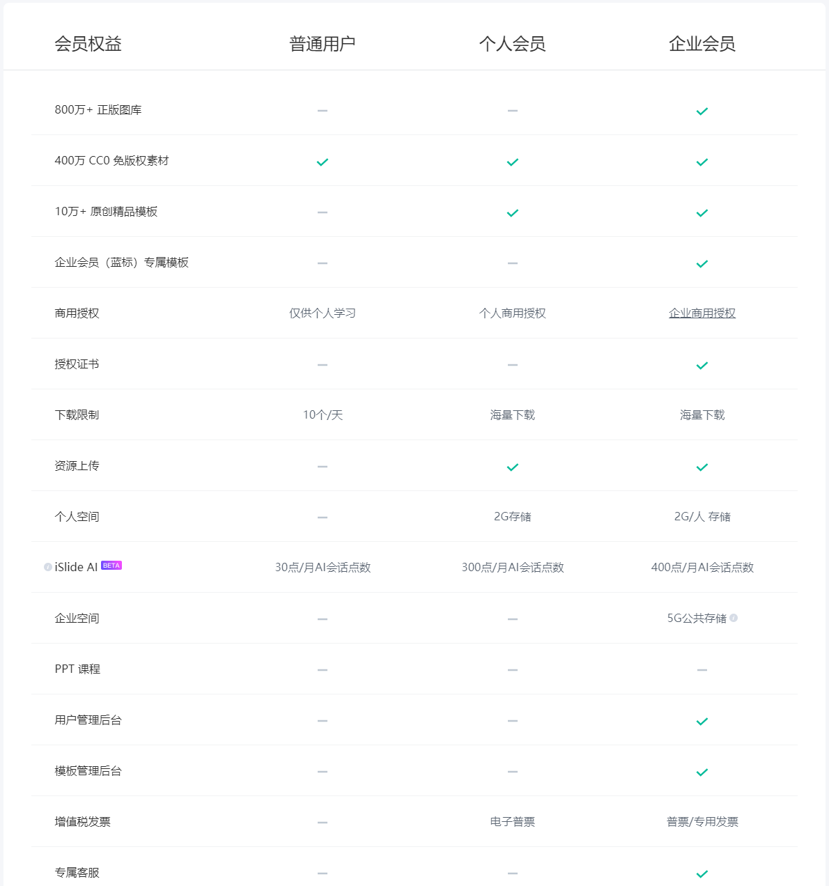 iSlide 企业会员权益包含个人会员插件版所有功能和资源。企业版会员还可以享受以下权益: