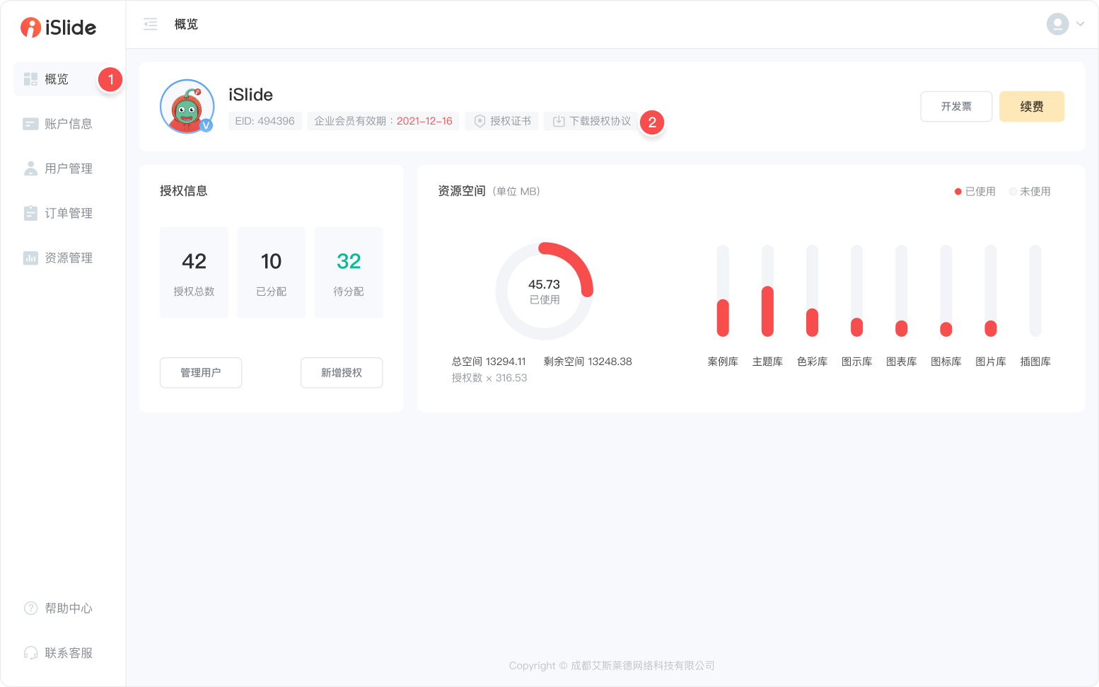 iSlide 与视觉中国合作,视觉中国授予 iSlide 企业会员可以在制作 PPT 中一键插入图片,但不授予在其他地方使用的权力,企业用户可以在管理后台查看对应的授权证书和下载授权协议。