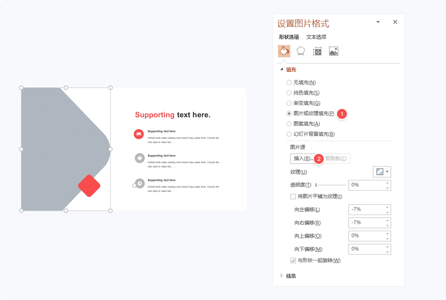 1. 如果想要将图示中“图片”的“形状占位”更换成本地电脑中的图片,可以在“设置图片格式”中设置;