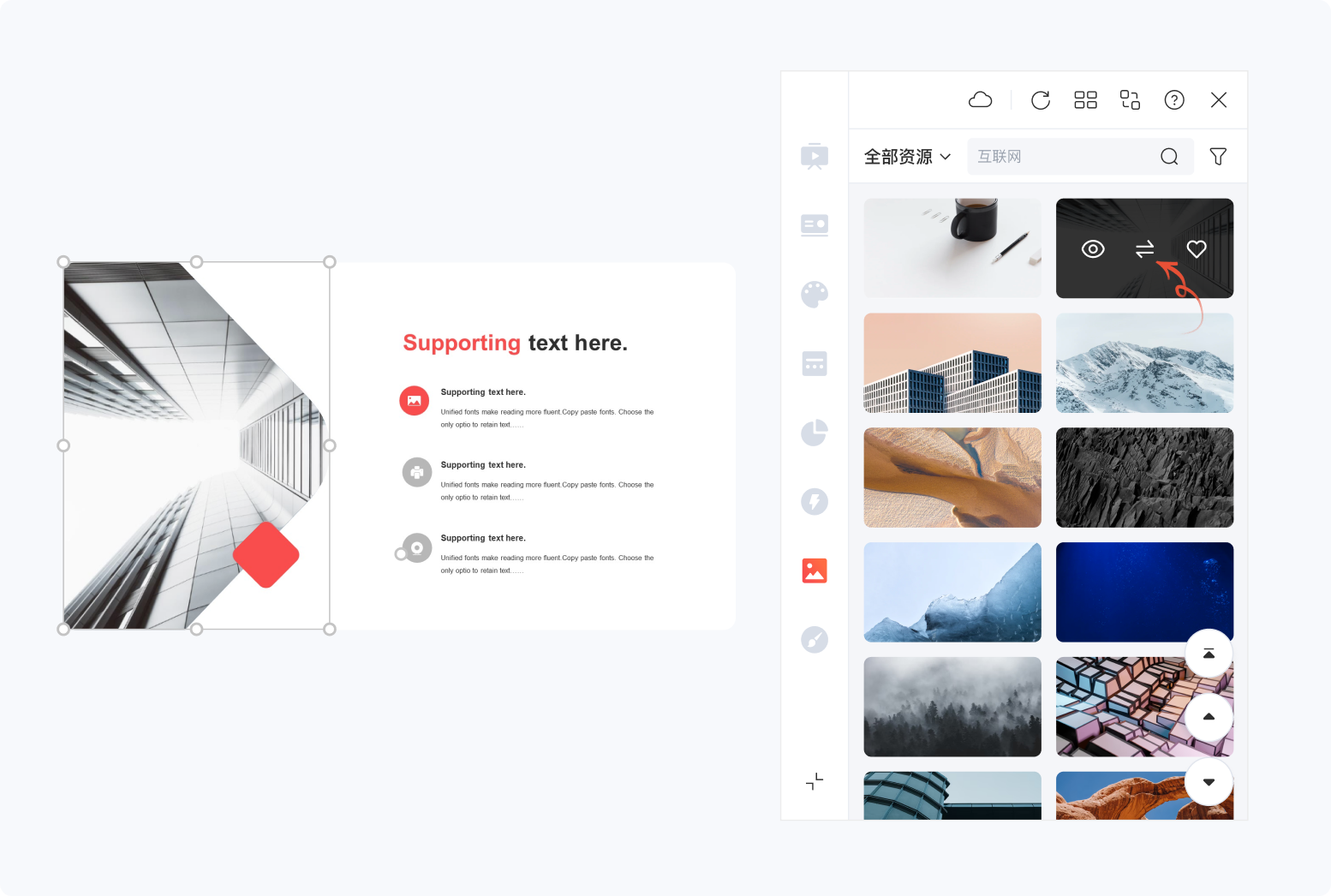 1. 鼠标选中图示中“图片”的“形状占位”,在【图片库】选择合适的图片,鼠标点击该图片可以一键替换;