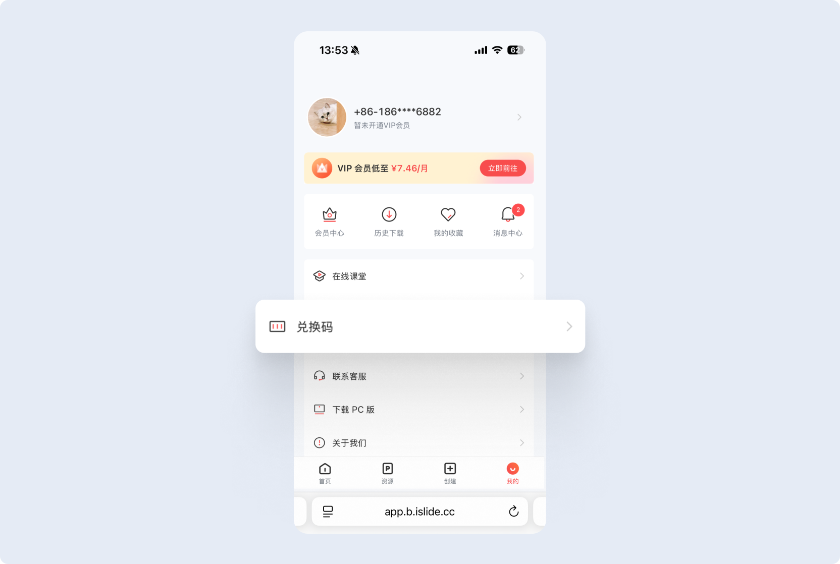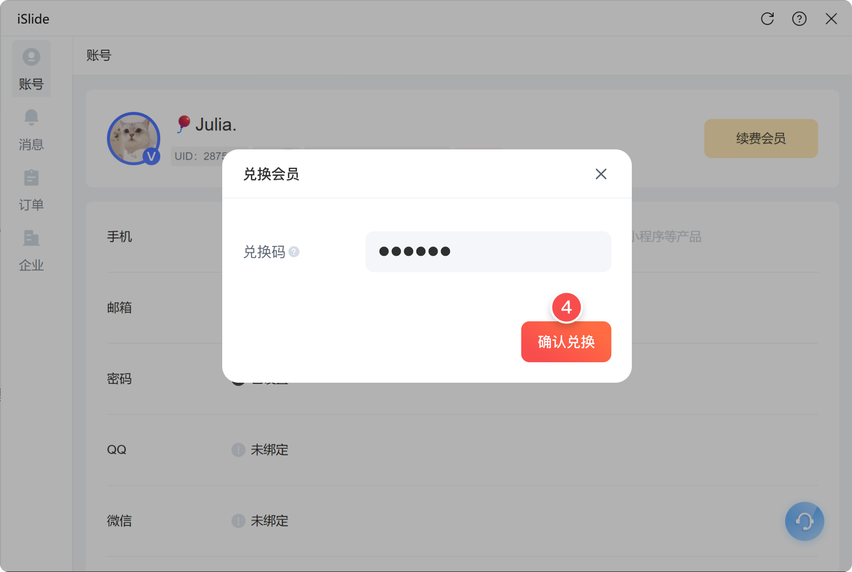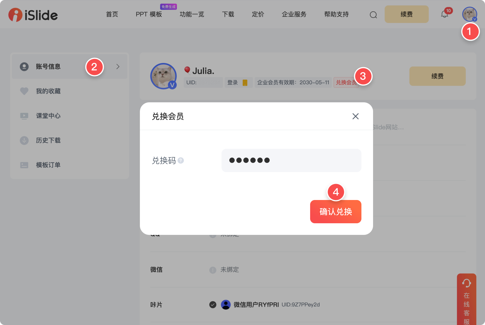 登录 iSlide H5,选择菜单 我的 > 兑换码,输入兑换码。