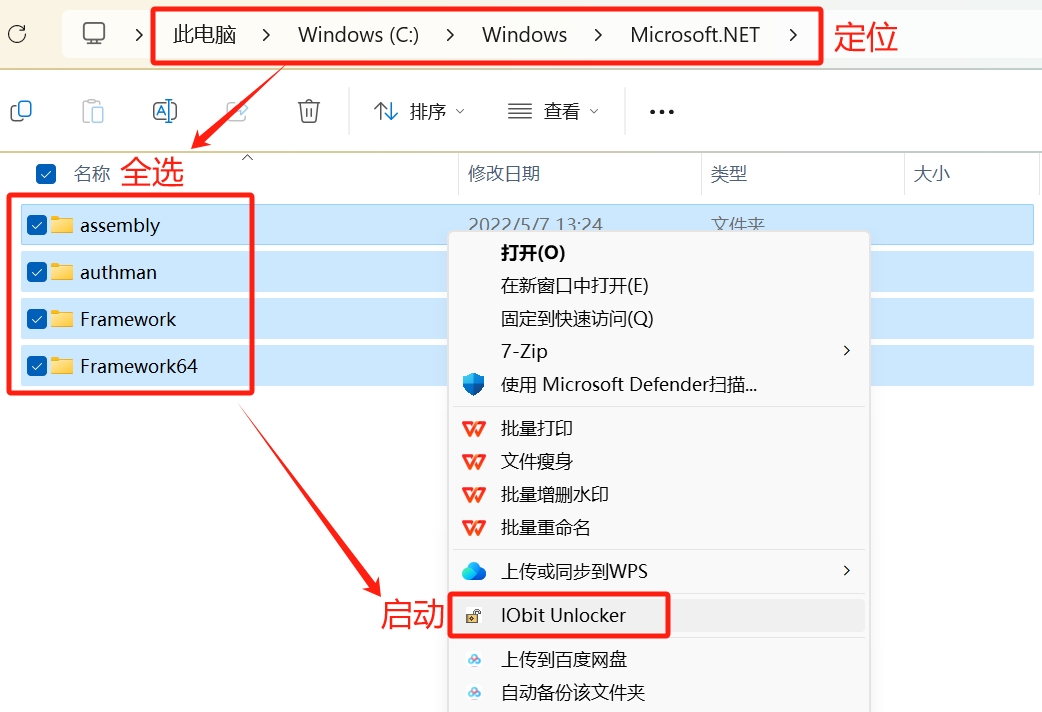 第二步,启动文件资源管理器,复制 C:\Windows\Microsoft.NET 进行定位 ---> Ctrl+A 全选定位到的文件夹 --- > 右键点击 IObit Unlocker