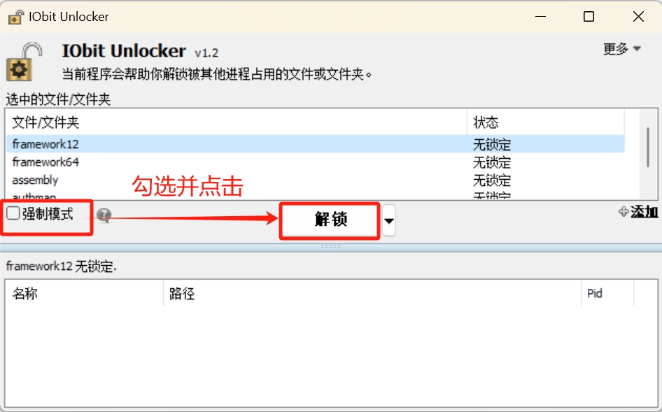 第三步,务必在打开的 IObit Unlocker 中勾选【强制模式】并点击【解锁】进行解除占用(页面提示的其他信息可忽略)