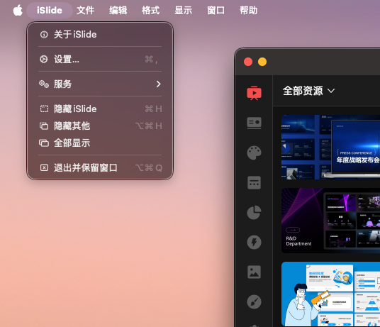 - 启动iSlide程序,在电脑桌面左上角,点击iSlide图标,选择【设置】菜单进入iSlide偏好设置面板;
