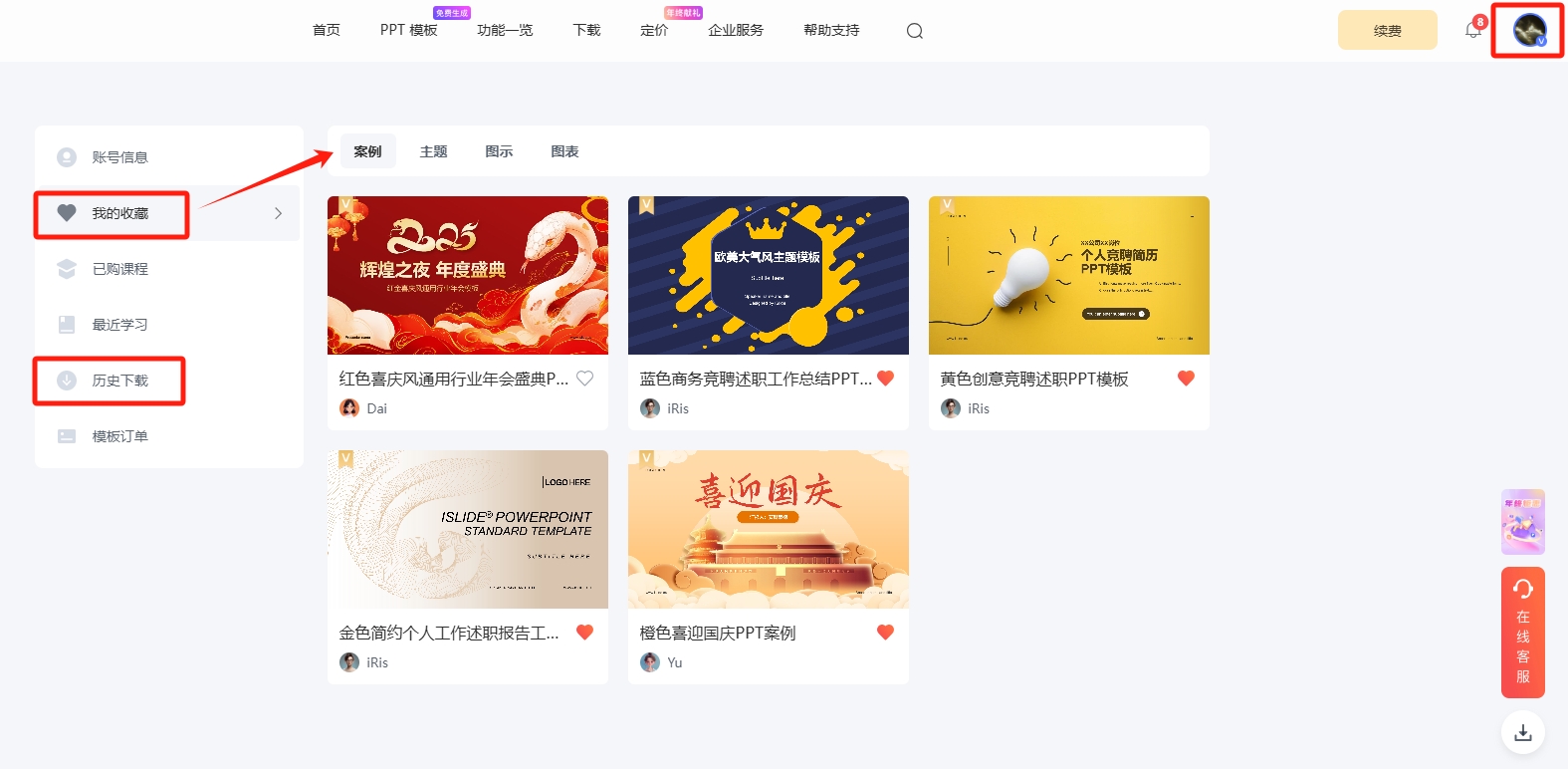 登录 iSlide 账号后,在官网右上角点击账号头像,页面左侧点击【我的收藏】、【历史下载】即可查看案例、主题图示、图表对应资源记录。