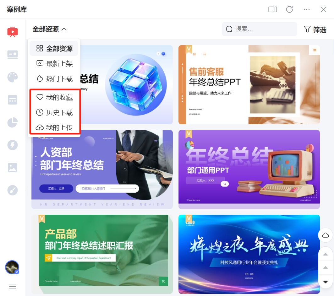登录 iSlide 账号后,启动对应资源库,点击【全部资源】旁的"∨"图标,选择【我的收藏】、【历史下载】、【我的上传】即可查看对应资源记录;