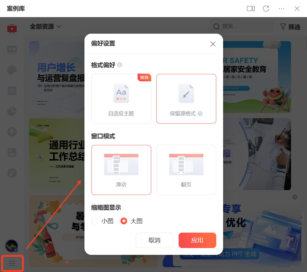 启动 iSlide,在左侧边栏下方位置点击“三横”,进入偏好设置页面。窗口模式和资源缩略图显示设置方法同 Windows 版。