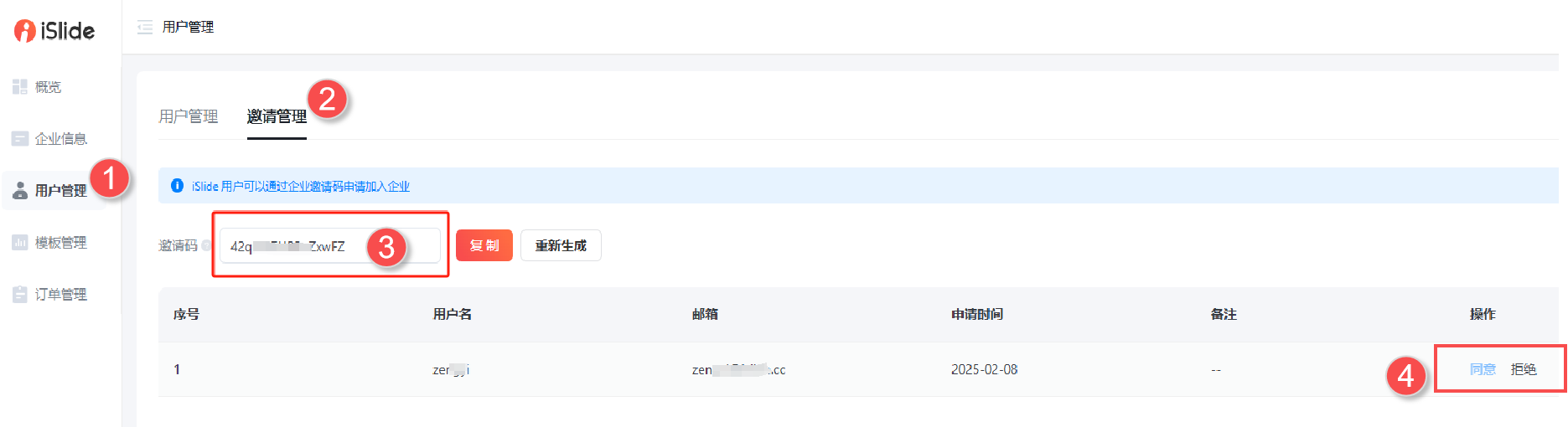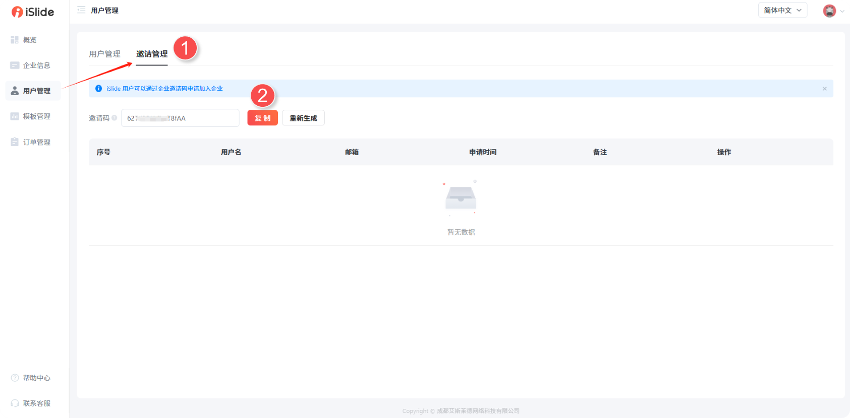 1. 管理员在后台复制【企业邀请码】,将邀请码发送给员工;