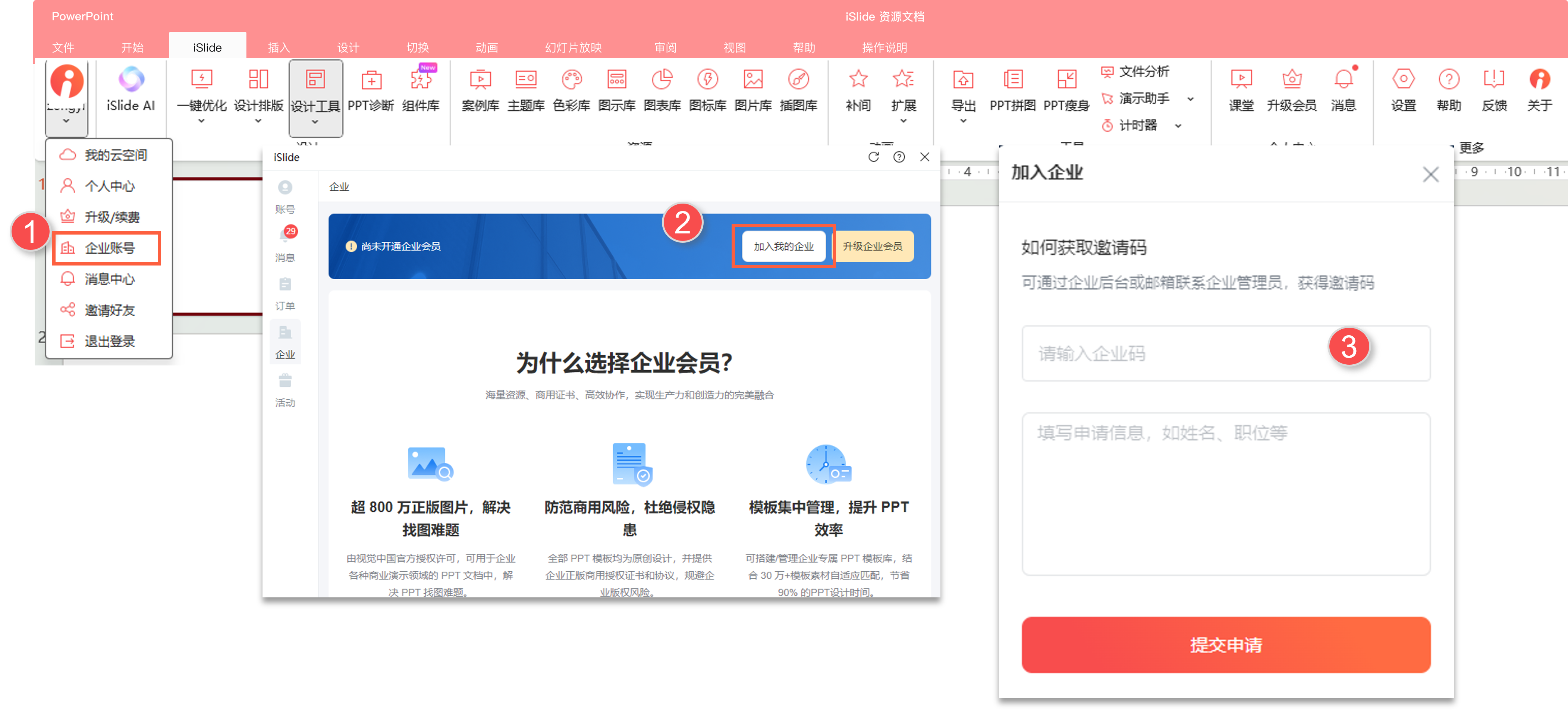 2. 员工进入【个人中心】-【企业】-【加入我的企业】,粘贴邀请码并提交申请;