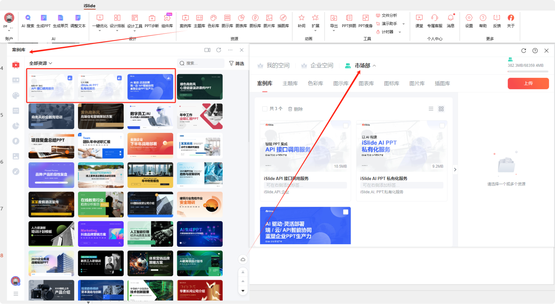 - 上传权限配置:可为员工开启【企业空间】或【部门空间】的上传权限,授权其上传模板至对应空间。
