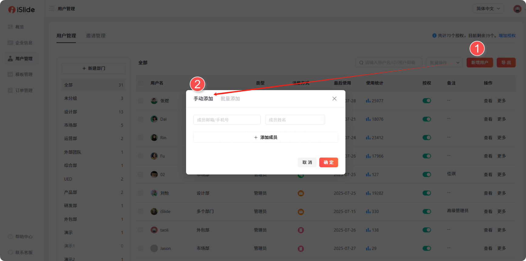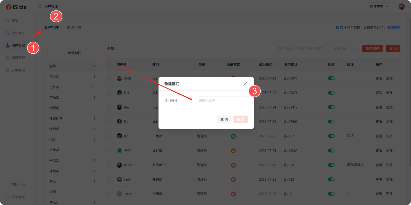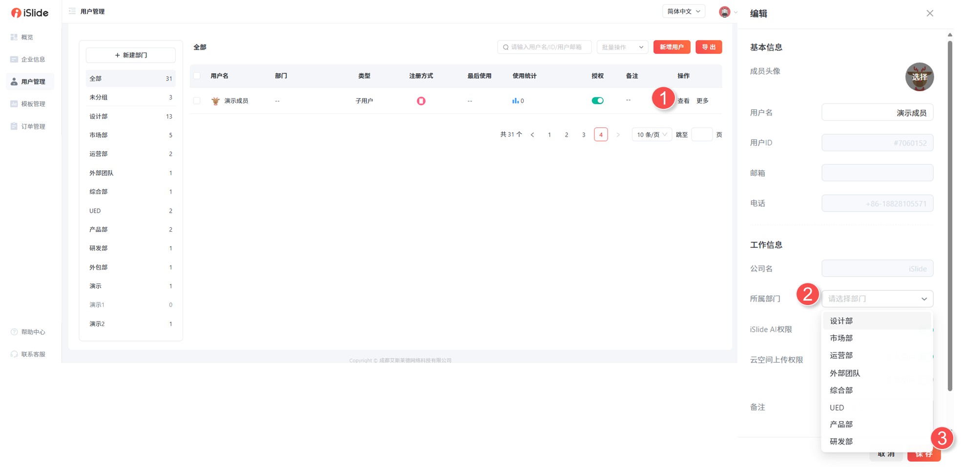 - 分配部门:将员工分配至对应部门后,系统将自动授予其该部门模板素材的查看权限;