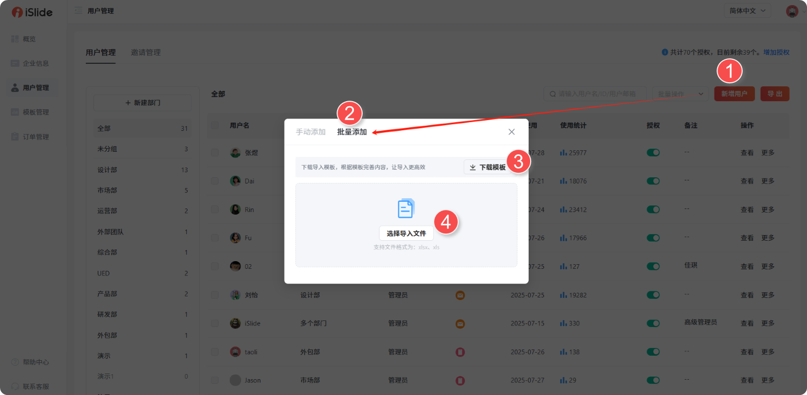 批量导入:下载模板,填写账号信息后上传,即可一次性导入多个子账户。