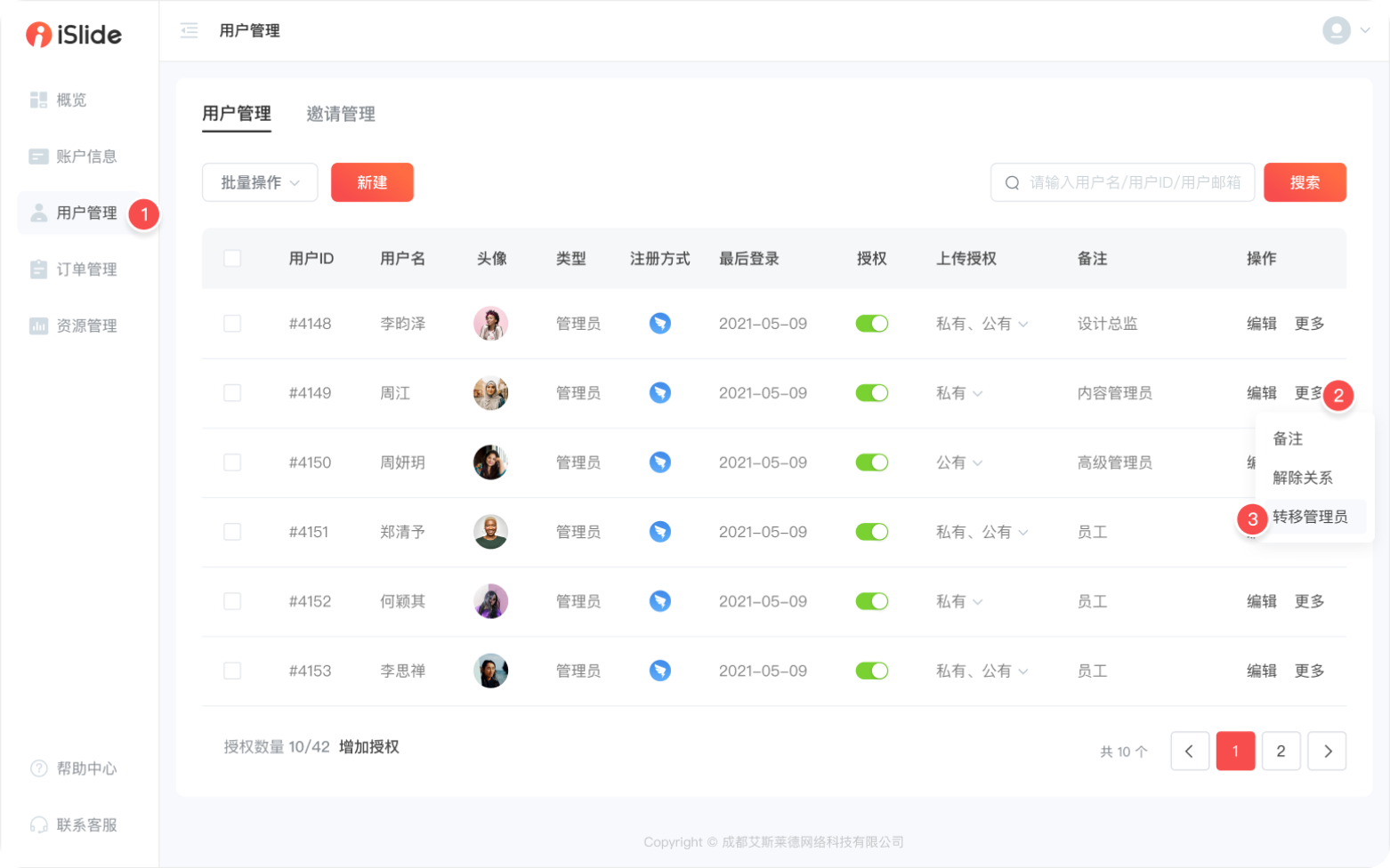 1. 在后台用户列表中选中当前管理员账号,点击【更多】-【转移管理员】;