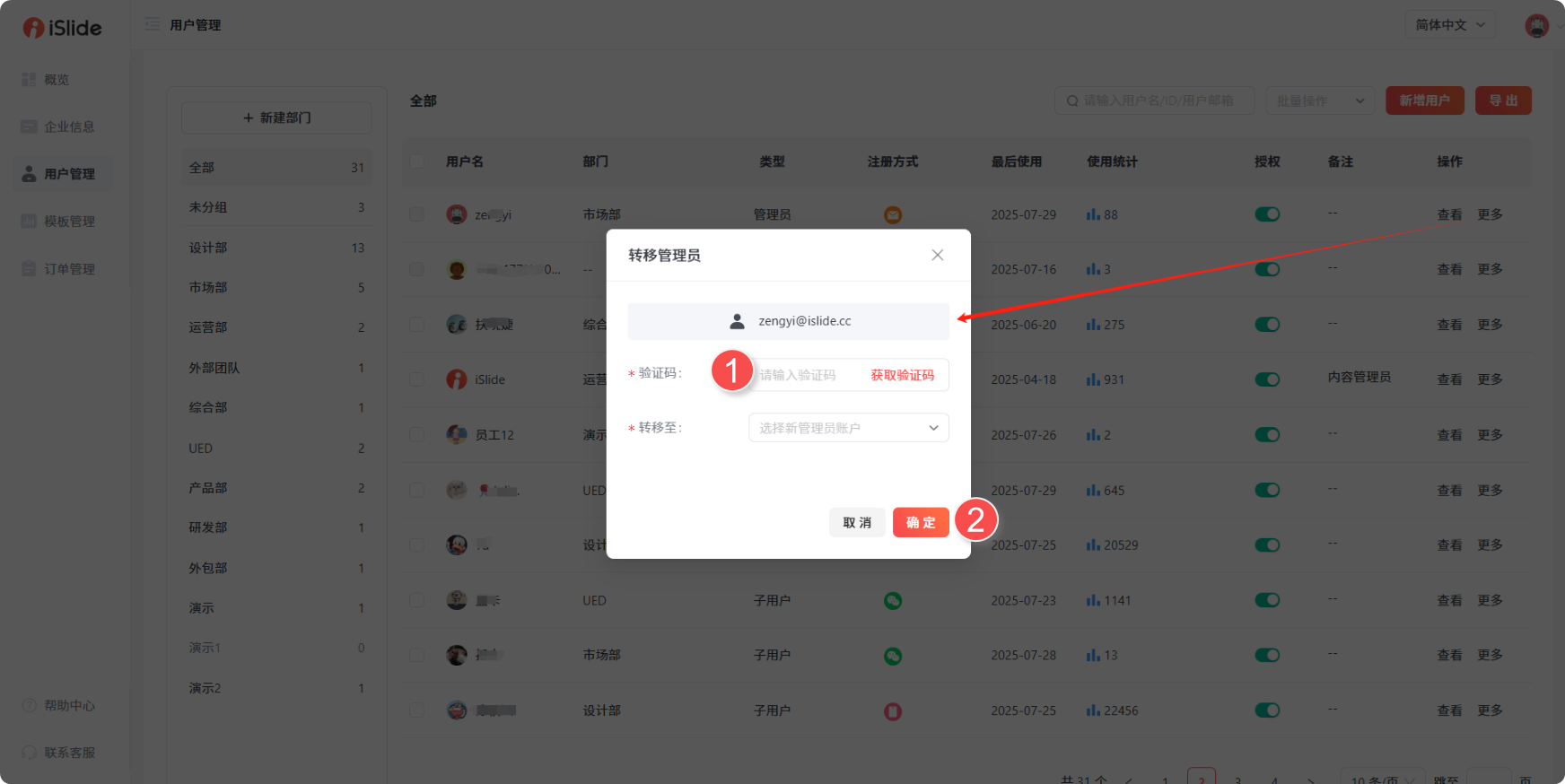 3. 点击【确定】完成转移操作,原管理员将自动降级为该企业下子用户。