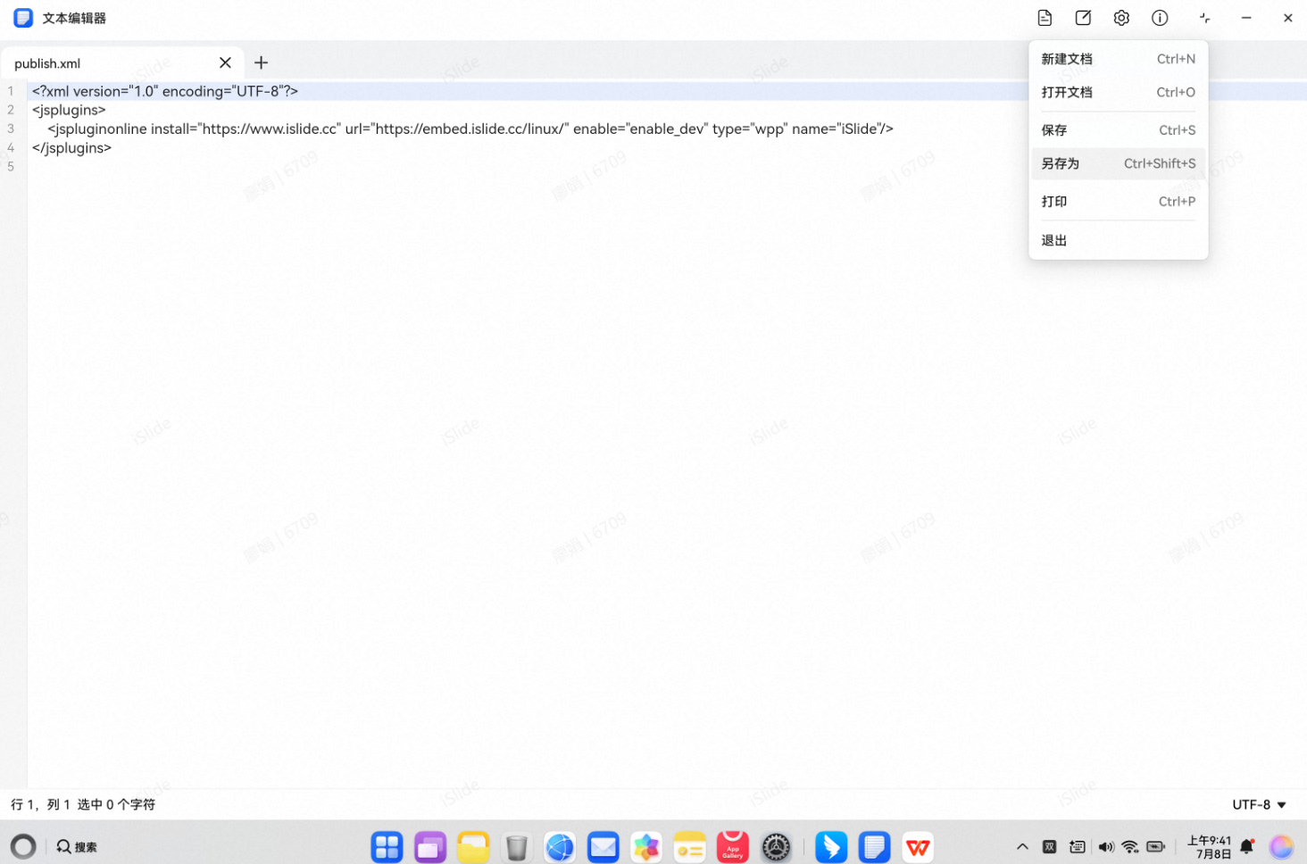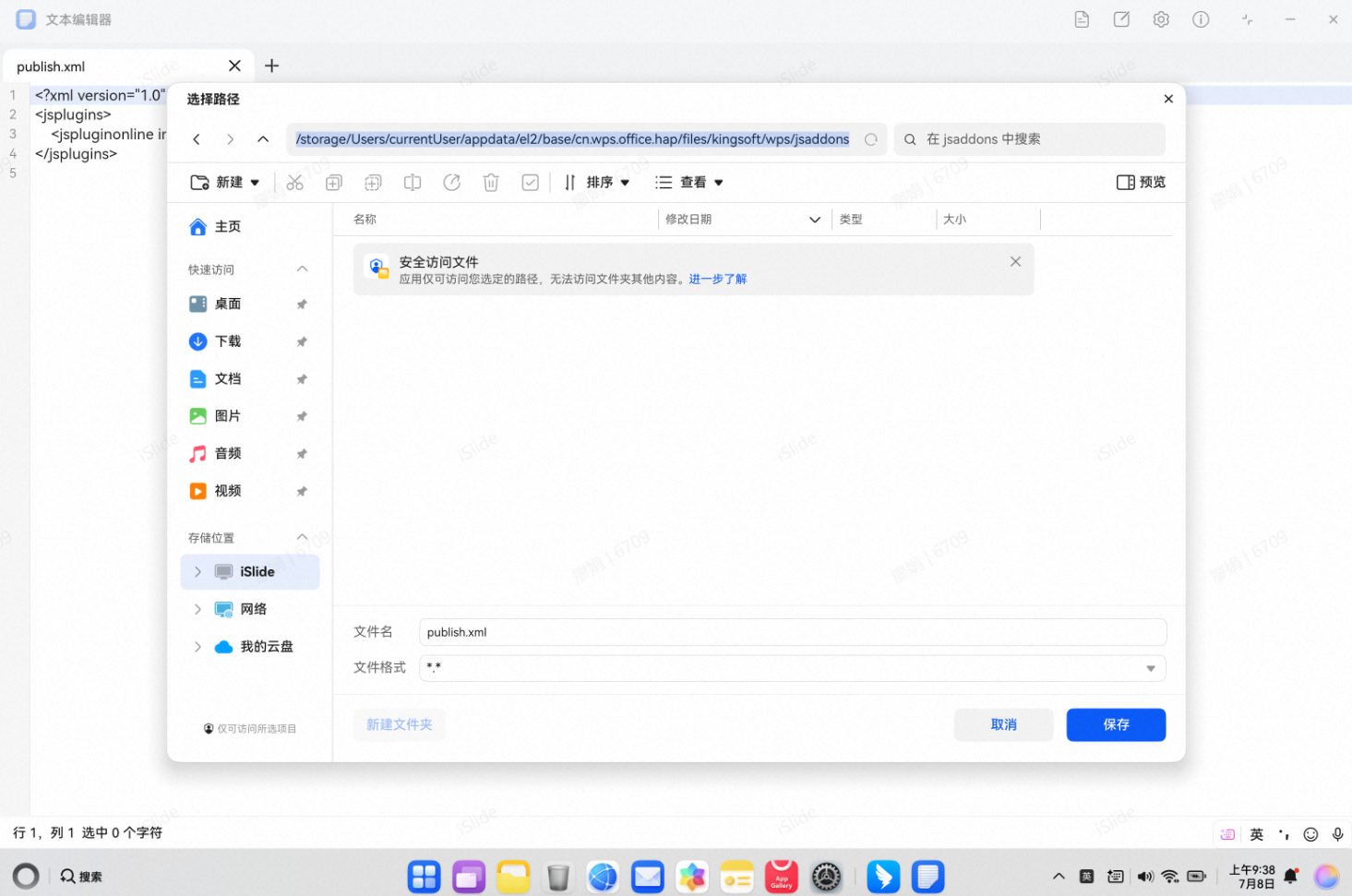 3. 使用文本编辑器打开“publish. xml”文件,右上角菜单“文件” > “另存为”(或者使用快捷键Ctrl+Shift+S),在地址栏粘贴“/storage/Users/currentUser/appdata/e12/base/cn. wps. office. hap/files/kingsoft/wps/jsaddons”,回车跳转到对应目录下,变更文件格式为*.*,保存;