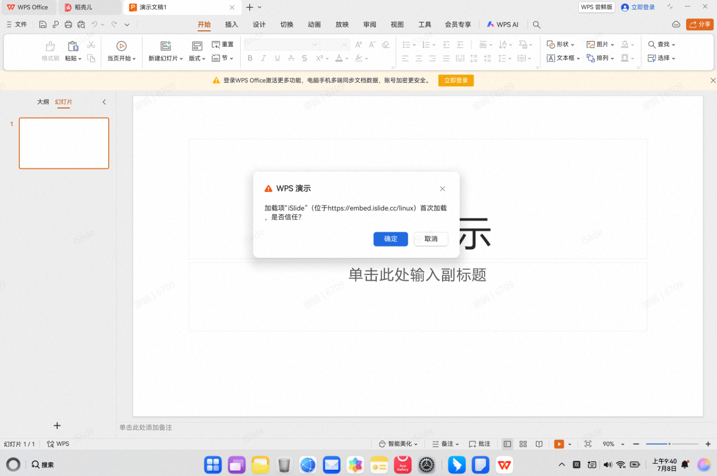 4. 完全关闭WPS后再重启,并新建一个空白PPT文件,在是否信任的弹窗中点击“确定”,即可加载iSlide。