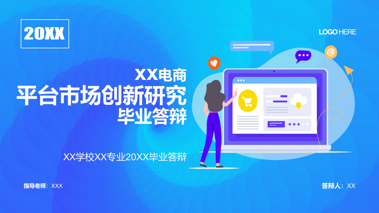 蓝色渐变插画蒂娜上平台市场创新研究毕业答辩PPT模板
