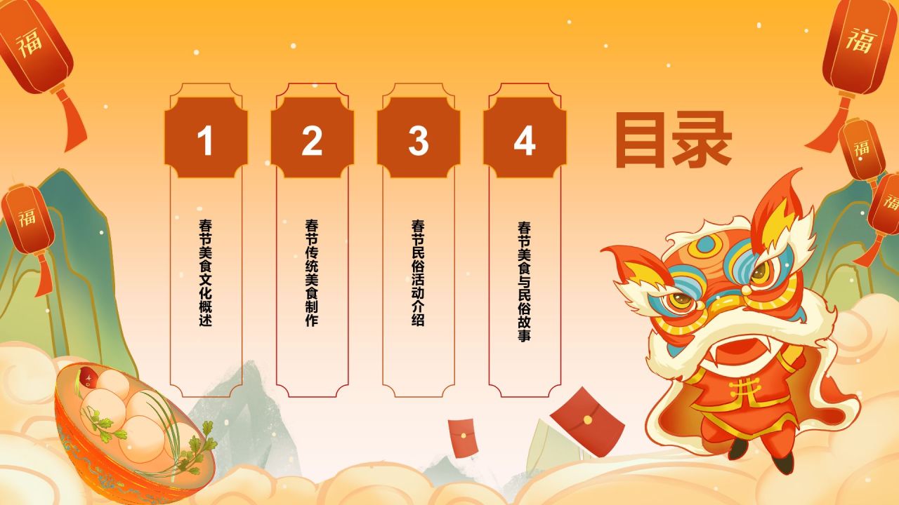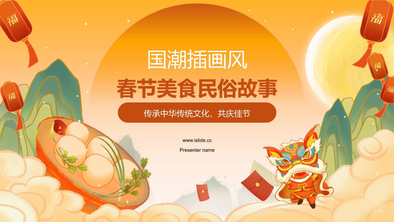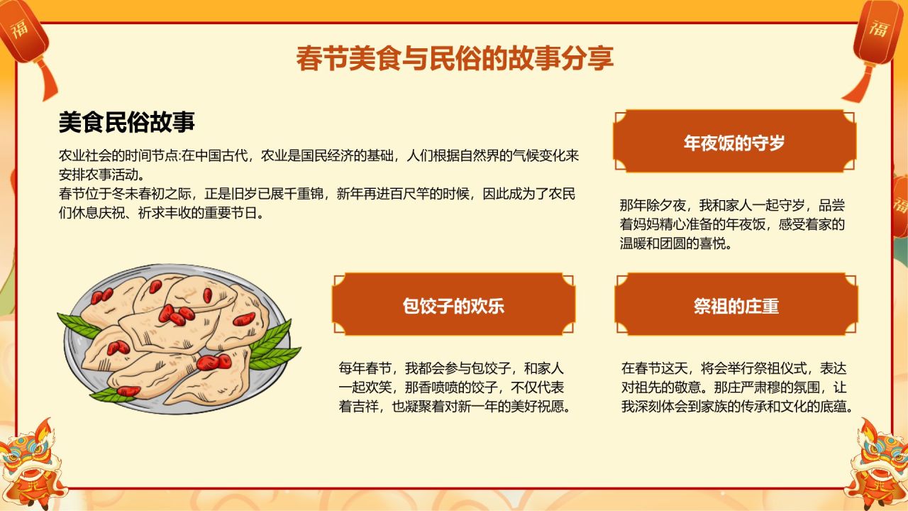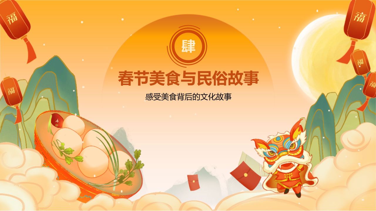 橙色国潮风美食与民俗的春节故事PPT模板