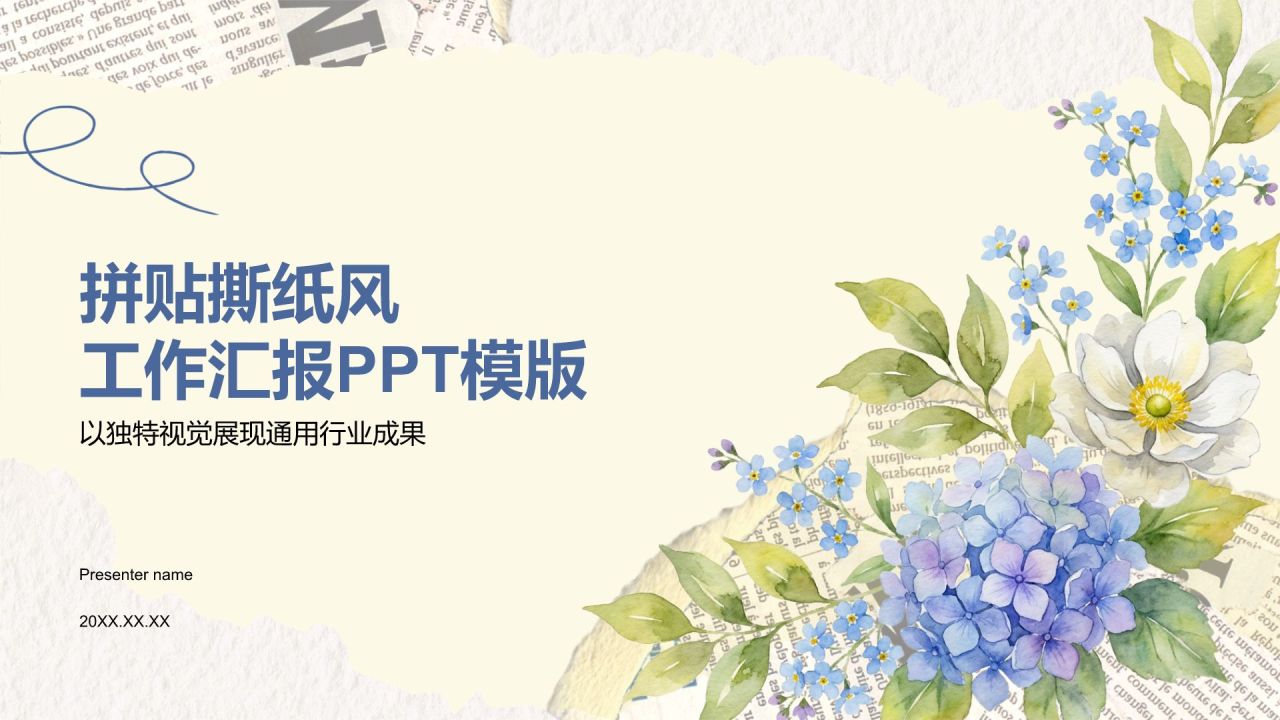 蓝色插画风拼贴撕纸风工作汇报PPT模板