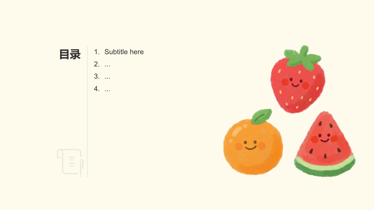 本课件以水果插画卡通可爱为主题,适合教育培训领域,为教师和学生提供生动有趣的教学素材,激发学习兴趣。